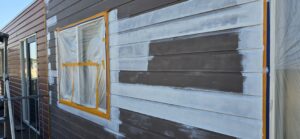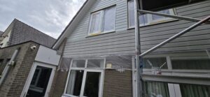 Het schilderwerk van de trespa boeidelen en onderkant, panelen, deur, ramen boven verdieping van het daktaras, ramen midden verdieping en het plafond van de carport.