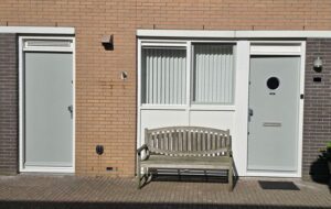 De voordeur in de kleur 6005 Ral Hoogglans Veveo Rain Guard.