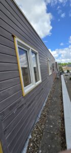 Het schilderwerk van de trespa boeidelen en onderkant, panelen, deur, ramen boven verdieping van het daktaras, ramen midden verdieping en het plafond van de carport.